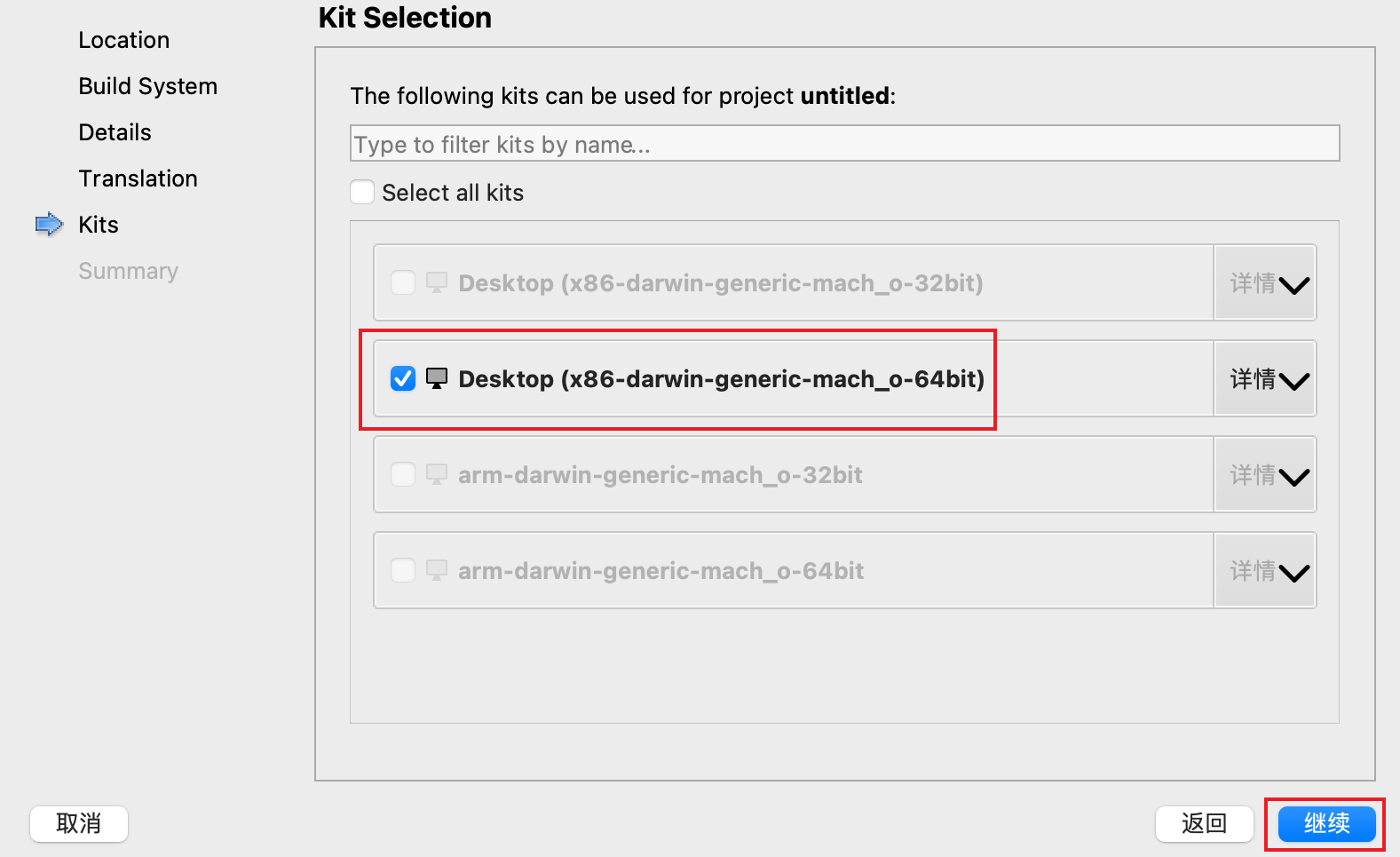 设置64bit那一项为默认开发环境:在Kits选项下设置默认的开发环境,并选择之前设置的指定版本的Qt