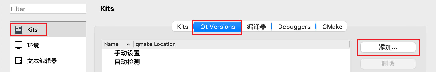 点击Qt Creator的偏好设置:在Qt Versions中添加本地对应的Qt路径
